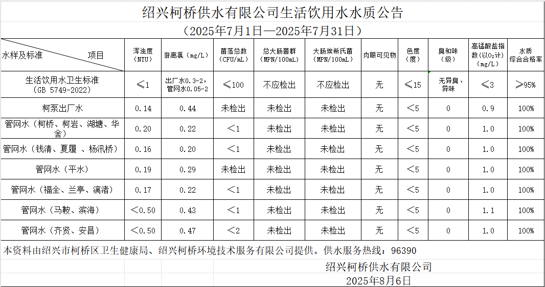 生活飲用水水質公告(2025年7月1日—2025年7月31日)